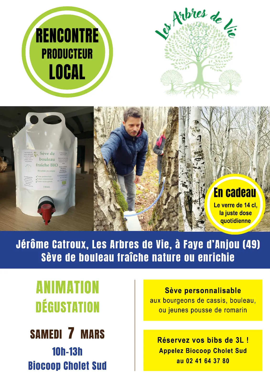 - Les Arbres de Vie (Faye d'Anjou, 49) : uniquement à Biocoop Cholet Sud le samedi 7 mars entre 10h et 13h.