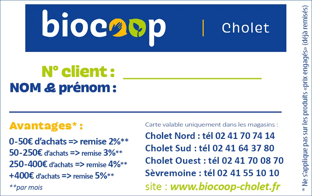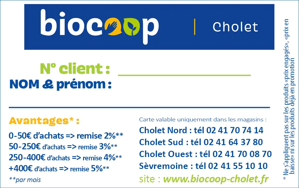 Lorsque vous créez un compte fidélité dans l'un des 4 magasins bio Biocoop Cholet Sud, Nord, Ouest ou Biocoop Sèvremoine, il fonctionne dans les 4 magasins : vos montants d'achat dans les différents magasins se cumulent tous sur votre compte.