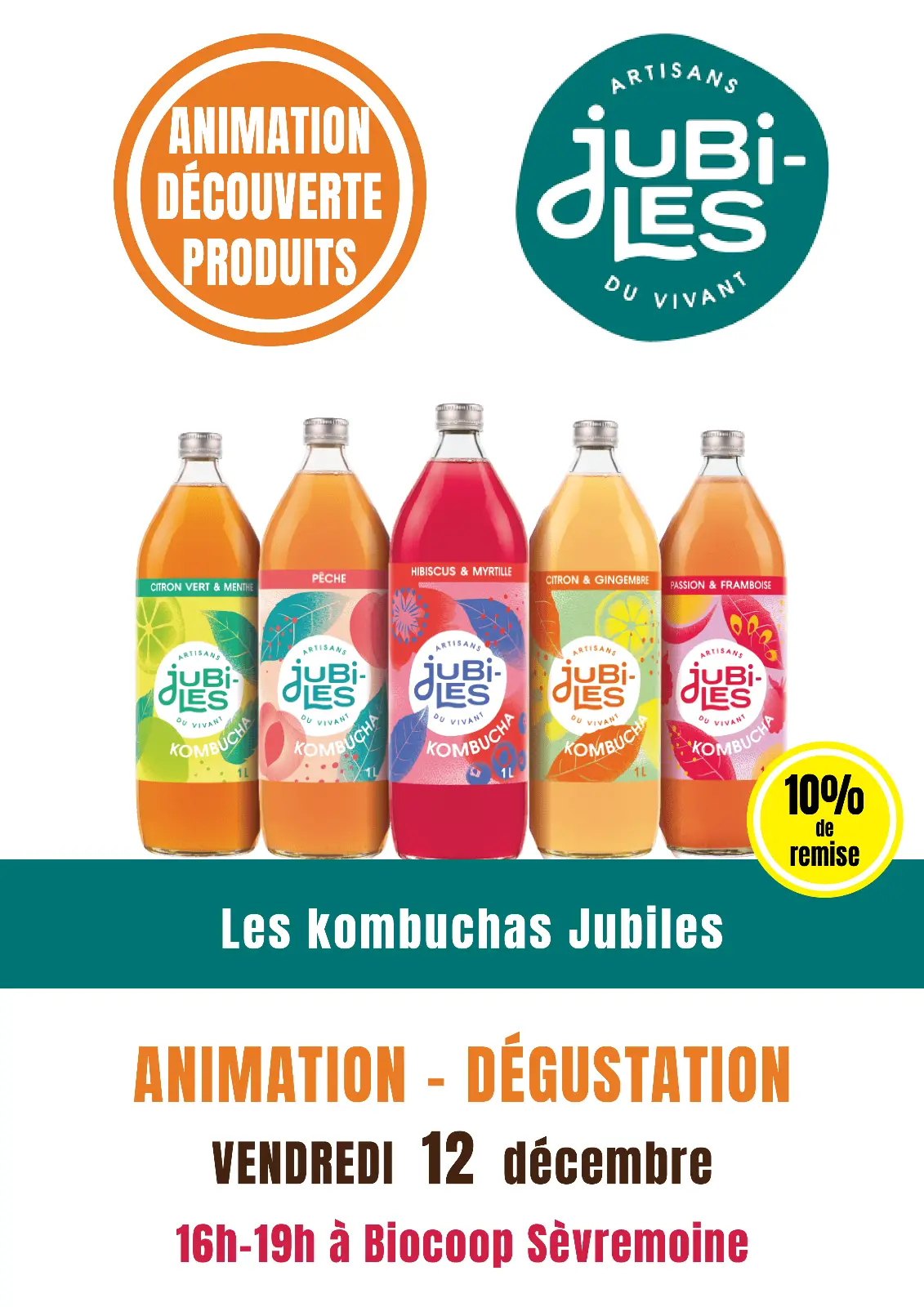 Les kombuchas Jubiles seront en dégustation à Biocoop Sèvremoine vendredi 12 décembre de 16h à 19h : c'est l'occasion de les découvrir !