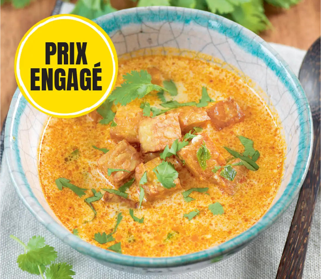 3- Verser la soupe au curry dans 4 bols, ajouter les cubes de tempeh frits et parsemer de coriandre ciselée.