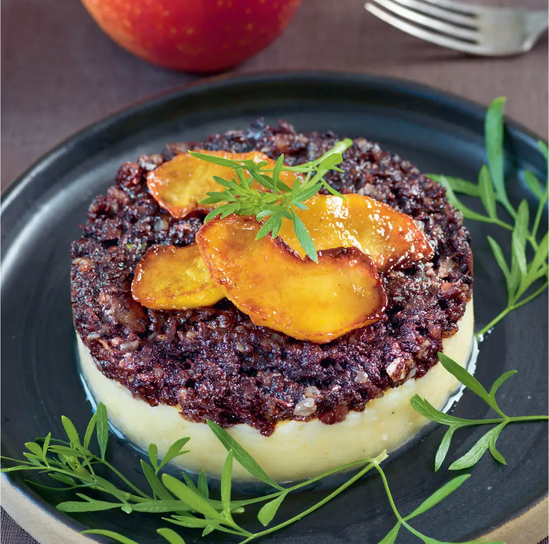 5- À l’aide d’un cercle, placer une couche de purée de céleri au fond des assiettes et couvrir d’une couche de boudin à l’oignon. Placer quelques tranches de pomme caramélisées dessus et glisser au four pour 5 min. Servir chaud.