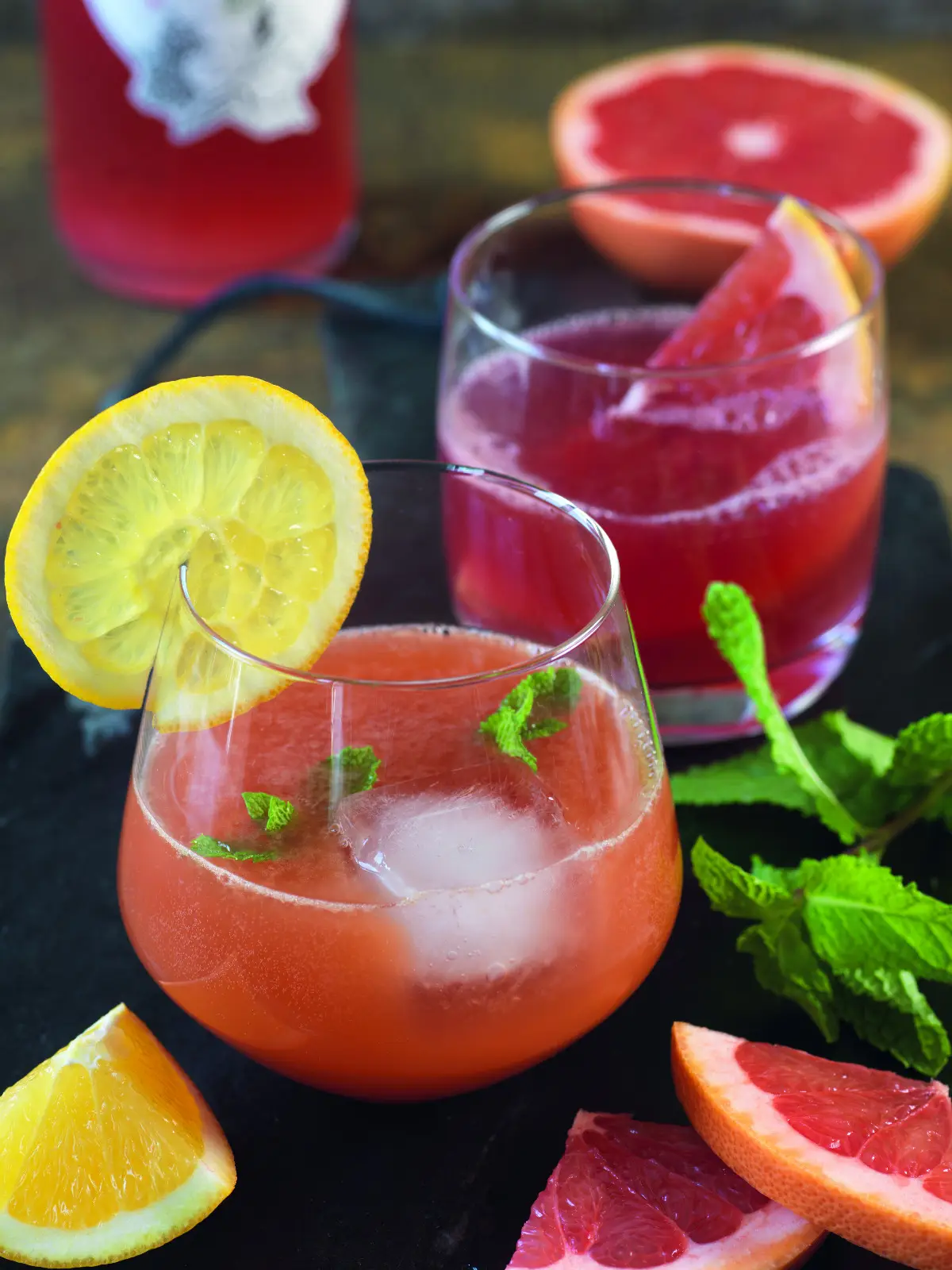 - Presser et filtrer le jus du pamplemousse. Dans chaque verre, verser 1 cs de sirop d’hibiscus et 3 cs de jus de pamplemousse.