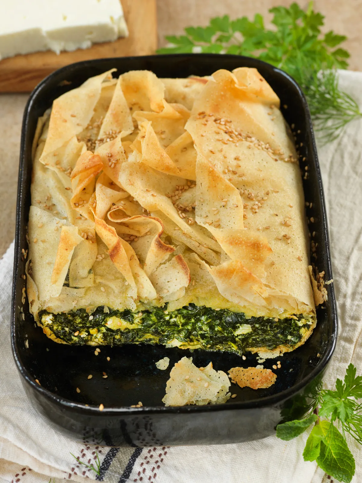 5. Préchauffer le four à 180°C. Verser les épinards dans le moule en tassant puis rabattre les feuilles de brick l’une après l’autre sur la farce. Ajouter un filet d’huile d’olive sur le dessus, parsemer de graines de sésame et enfourner pour 40 à 45 min. Servir chaud ou froid.