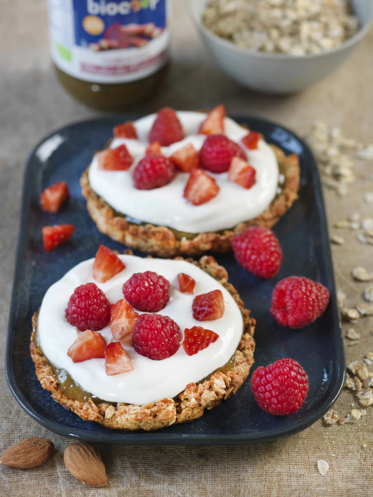 4. Étaler 1 cs de confiture de rhubarbe sur chaque tartelette. Couvrir généreusement de chantilly au yaourt de chèvre et décorer de fruits rouges. Placer les tartelettes au frais pour 1 h avant de les déguster.